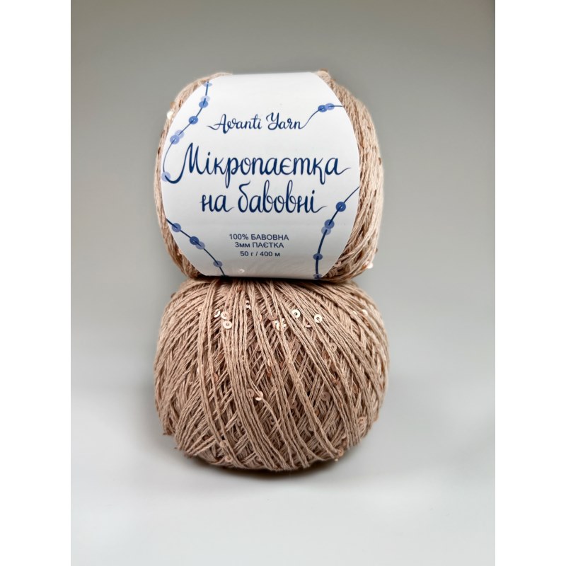 Натуральна нитки легкої крутки, оздоблена 3 мм паєтками. Пряжа Avanti Yarn “Мікропайєтка на бавовні” може бути використано самостійно чи в поєднанні з іншою ниткою, до прикладу мохеровою для виготовлення особливо якихось нарядних виробів, або ж просто стильних плечових виробів: джемперів, кардиганів, пуловерів і т.д.